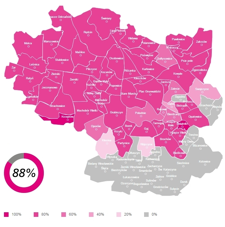 Obecnie do pracy produkcyjnej (tryb „go live") przekazano 67 ze 109 obszarów Wrocławia, czyli łącznie 210 tys. liczników, które odczytywane są tam z zakładaną wysoką skutecznością wynoszącą 99,5%.